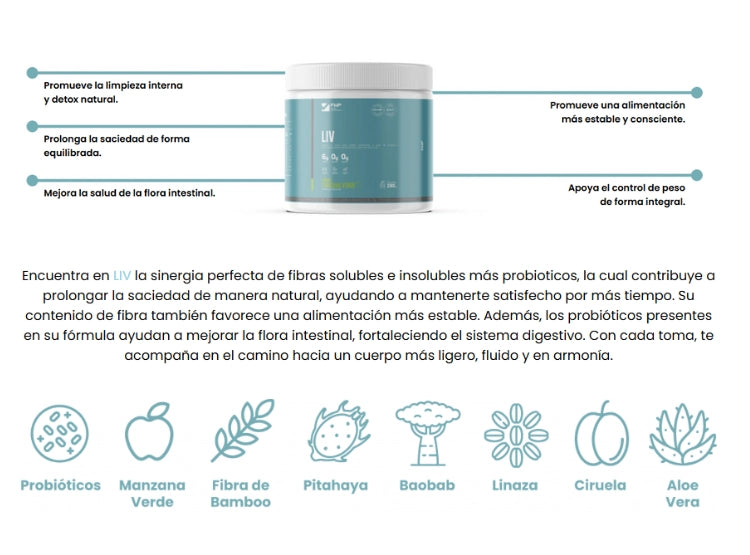 Descubre en LIV la combinación perfecta de fibras solubles e insolubles + probióticos , diseñada para apoyar tu bienestar desde el interior.